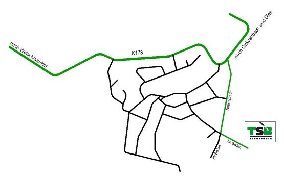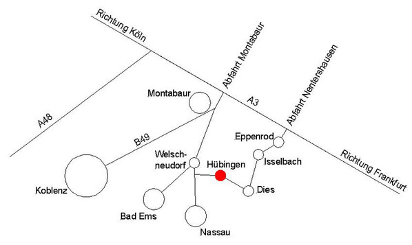Sie gelangen über Gackenbach oder Dies nach Hübingen (in der Skizze von rechts).